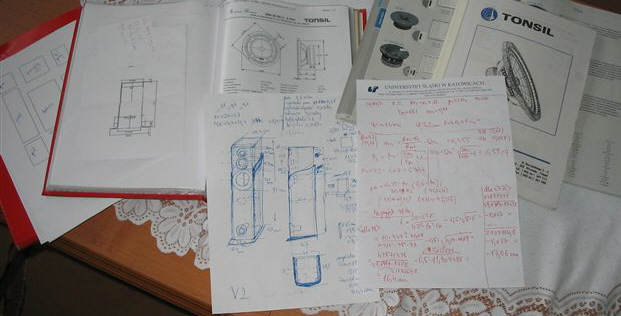 Postanowiłem zrobić konstrukcję na popularnych , niedrogich przetwornikach które potraktowane z szacunkiem dadzą dobre rezultaty w stosunku do poniesionych kosztów. Szacunek to w tym przypadku indywidualnie dobierana zwrotka, obudowa porządnie obliczona i całość starannie wykonana jak tylko da się w warunkach domowego zacisza. Projekt: Ładnych kilka wieczorów zajęło mi obliczenie dwóch wariantów obudowy (dla 37 i 38 litrów), dobranie głośników, elementów zwrotnicy, obliczenie dech dla dwóch wariantów (z BR od spodu i na froncie) itd. Kompletowanie elementów zacząłem od rekonesansu w swoich pudłach i mozolnie zamawiałem taile , kupowałem w sklepach materiały oraz dałem pociąć dechy (do podstawowych obrysów, resztę jak otwory i profilowania to juz robótki ręczne maszynkami ręcznymi i narzędziami prostymi).