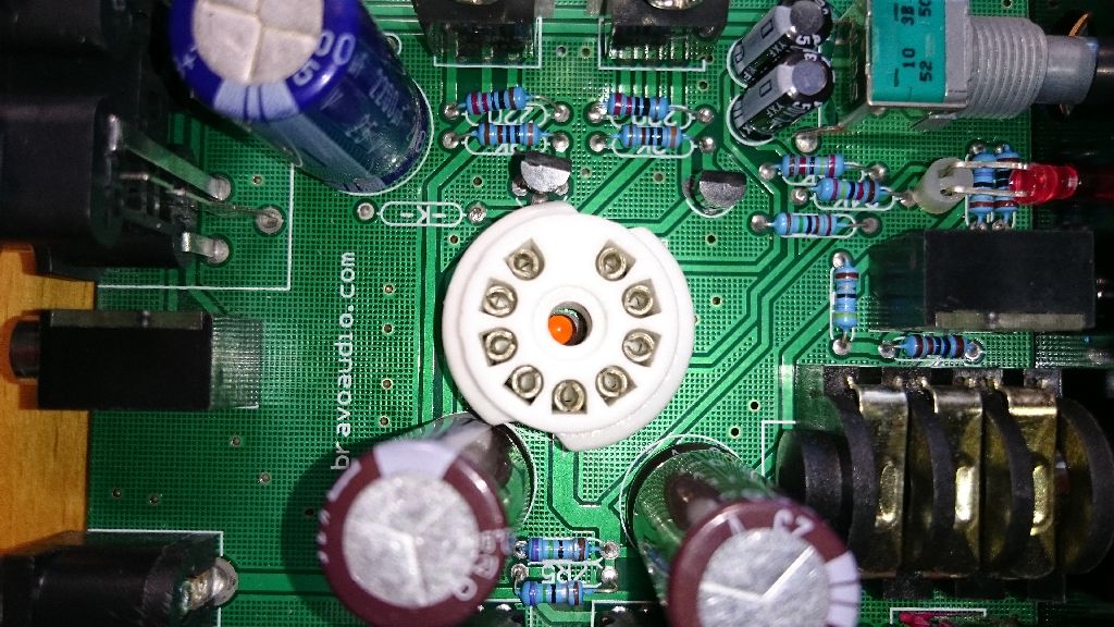 Kilka tygodni temu trafił do mnie mały wzmacniaczyk Bravo Audio V3 z nietypową wadą. Zachęcony zabawą z hybrydą Miu Audio MKTP-1, na prośbę właściciela zgodziłem się usunąć usterkę. Objaw dziwny - migająca nieskładnie niebieska dioda LED podświetlająca lampę. W takt tych rozbłysków w dźwięku a nawet bez wysterowania, pojawiał się na wyjściu sygnał w rodzaju zmodulowanego szumu, delikatnych trzasków. Normalnie można by podejrzewać lampę o zakończenie żywota, jednak analizując schematy znalezione w sieci, odkryłem że diody widoczne w tej przeźroczuystej obudowie nie służą tylko ozdobie. Biorą one udział w polaryzacji bazy tranzystora, będącego filtrem napięcia anodowego. Nie mogłem uwierzyć jak w tak dziwaczny sposób może się zepsuć dioda LED. Normalnie raczej całkiem zgaśnie, spali się. Trochę bez wiary ale znając już schemat, męcząc się dość długo z wstawioną LEDką pod podstawkę lampy, wymieniłem ją w końcu na nową. Trzeba było jeszcze dostosować wymiary jej kołnierza,a wszystko zrobić tak żeby za dużo nie wylutowywać, i nie sniszczyć płytki, widocznej przecież cały zcas przez ażurową obudowę. Kolor pozostał na prosbę taki jaki był, efekt wizualny jest bardzo fajny, trochę futurystyczny, nie kojarzący się z klasyką lampową.